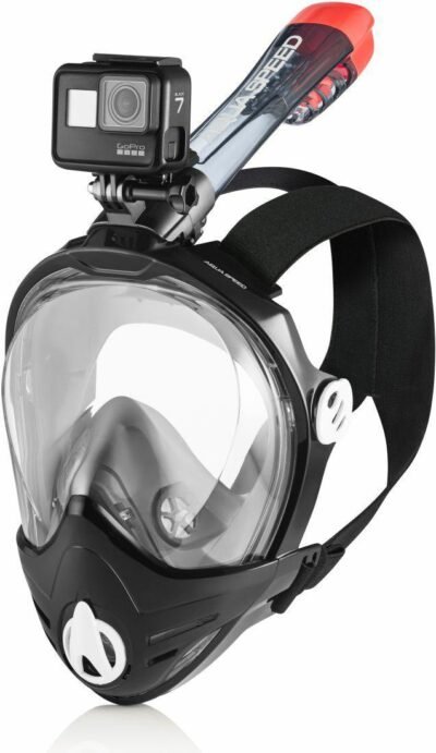 BRIZO Full Face Mask is an excellent choice for any recreational diving enthusiast. It provides comfort, a wide field of vision, and safety during every underwater adventure. High-quality materials and thoughtful technical solutions make it a reliable piece of equipment for the summer season. 100% silicone seal – comfortable fit and watertightness Unique air drainage system – prevents fogging Flat lens – no distortion, natural image underwater Wide field of vision 180° – panoramic view of the surroundings Long snorkel – allows for freer, deeper immersion Removable action camera mount – easy recording Double seal – high watertightness even with intensive use Impact-resistant polycarbonate lens – durability against mechanical damage Additional reinforcement at the bottom of the lens – greater durability Practical mesh bag – convenient transport and drying of the mask